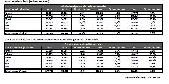 De gestuurde schadestroom, op basis van Amice informatie, blijft in het eerste halfjaar 16,6% achter op 2012. In de Amice-cijfers zitten calculaties waarbij zowel een opdrachtgever als een reparateur bekend is. De verhouding gestuurde schade versus niet gestuurde schade komt zo uit op 48,2 om 51,8 procent; in 2012 was dit 39,2 om 60,8 procent.